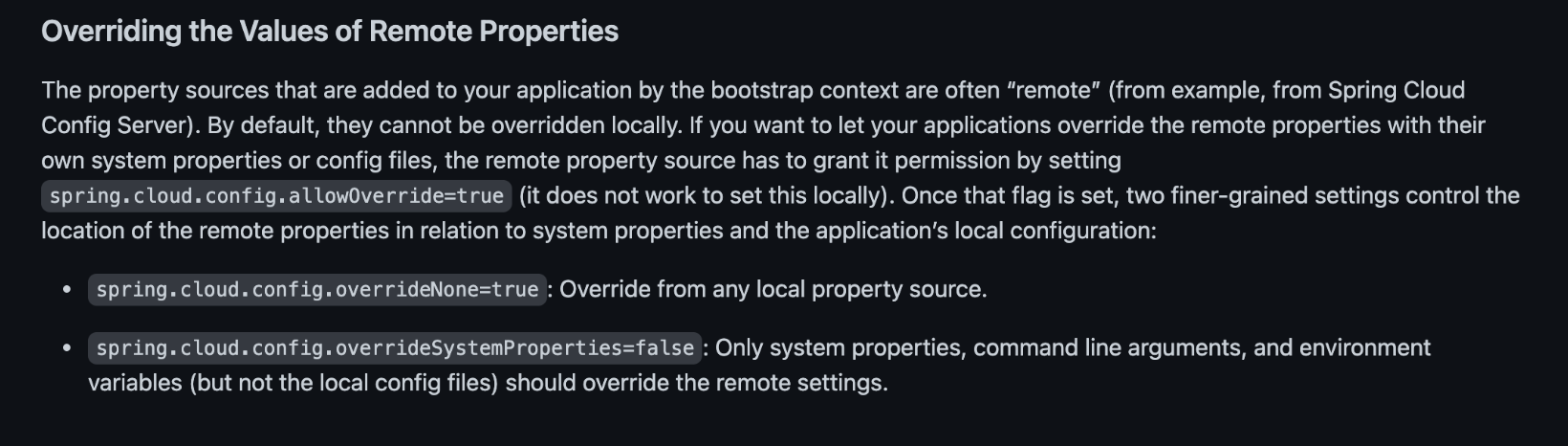 override하기 위해서는 remote properties에 spring.cloud.config.allowOverride=true 를 설정해줘야한다.