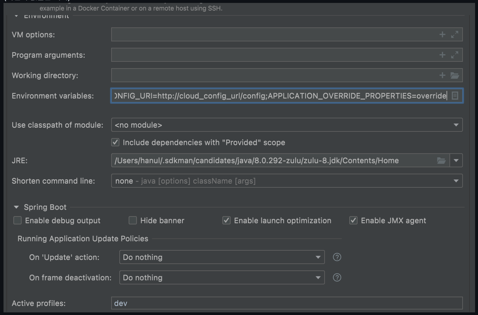 local에서 개발환경으로 프로젝트를 띄우기 위해 profile을 dev로 설정하고 Spring Cloud Config을 사용하여