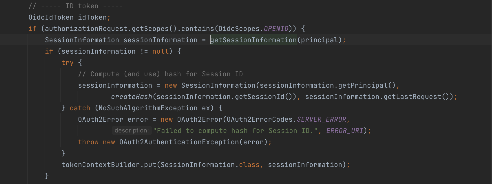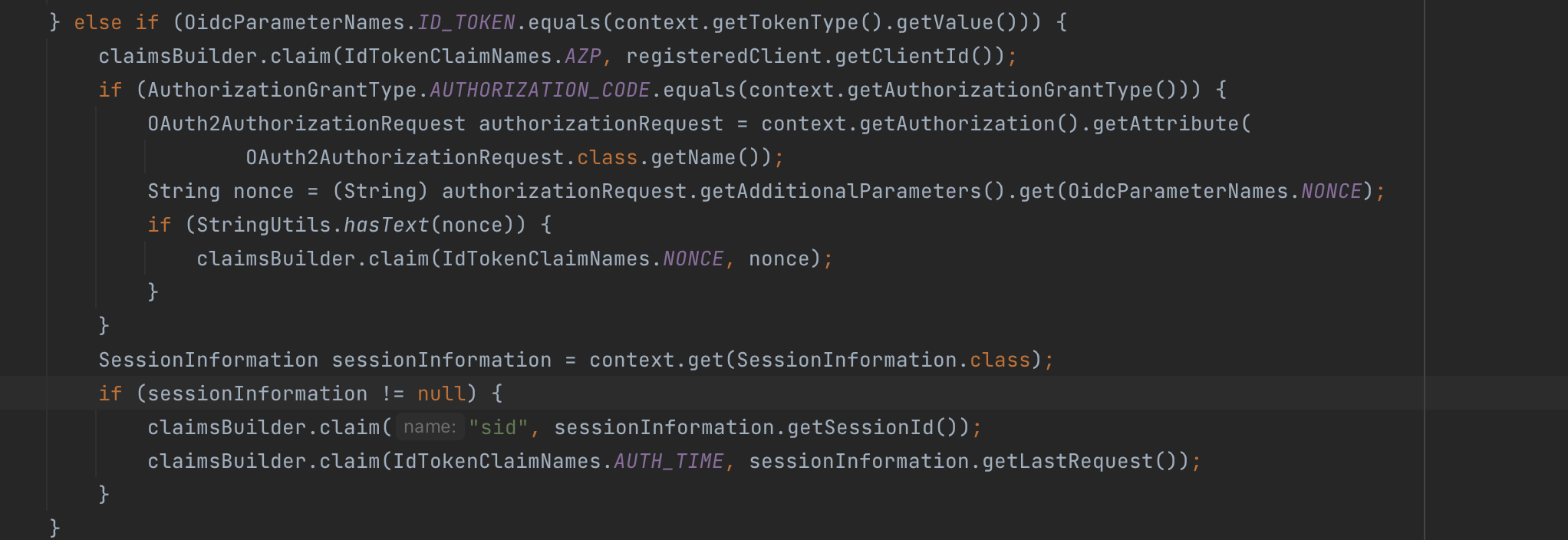 Spring authorization server 에서는 sessionInformation 값이 있으면 sid, auth_time 값을 oidc claim에 넣어서 만들어주고 있음.